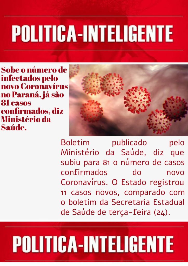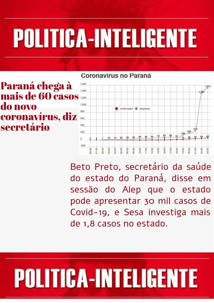Secretaria Estadual de Saúde, publicou um boletim recentemente que o Paraná apresenta 70 casos confirmados de covid-19 e a Secretaria Estadual de Saúde investiga 1.844 suspeita de covid-19.