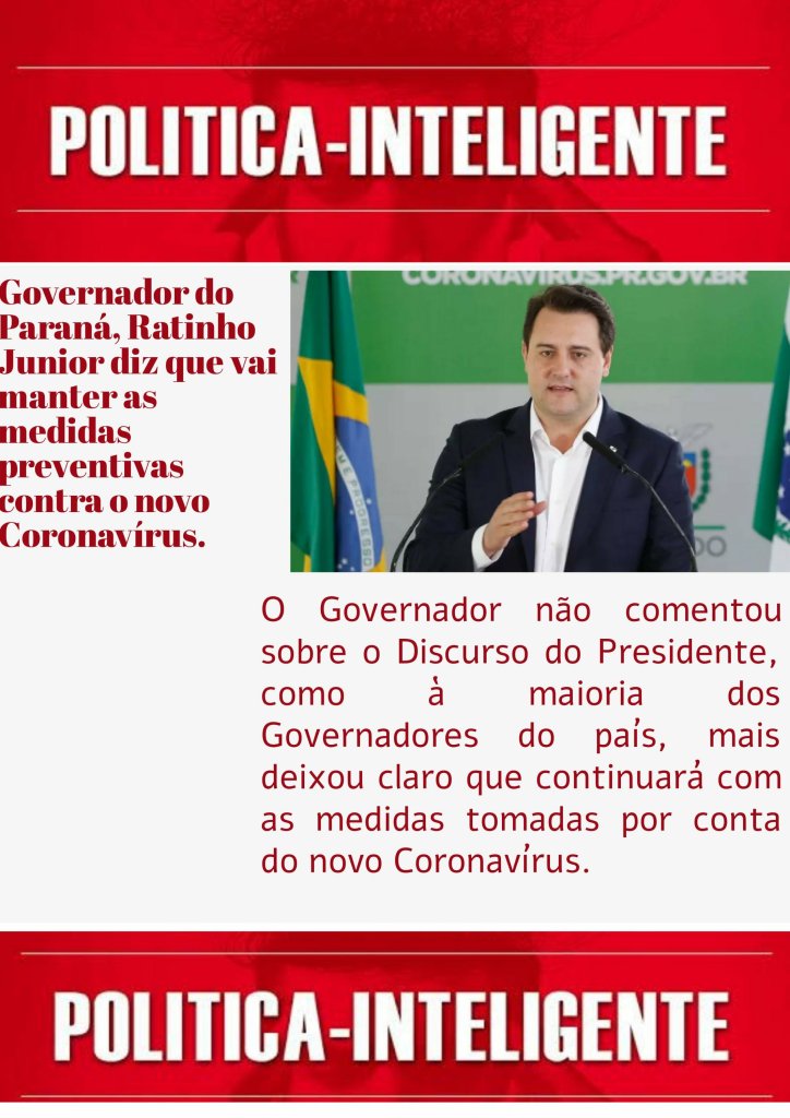 O Governador não comentou sobre o Discurso do Presidente, como à maioria dos Governadores do país, mais deixou claro que continuará com as medidas tomadas por conta do novo Coronavírus.